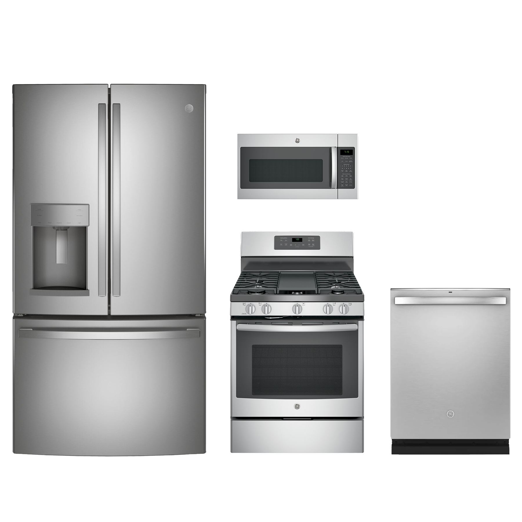 GE® 4 Piece Kitchen Package-Stainless Steel with french door refrigerator, free standing gas range, over the range microwave and built in dishwasherRead More